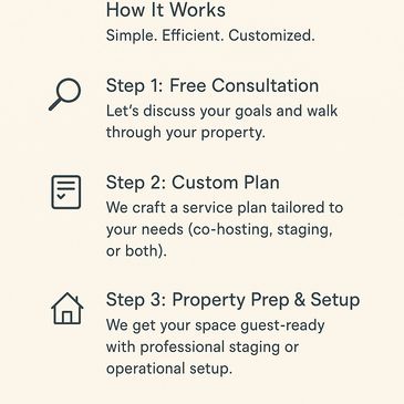 Our process is designed to understand your vision and assess your property’s potential. From there, we develop a personalized plan—whether co-hosting, staging, or managing—to ensure your space is guest-ready and generating results.